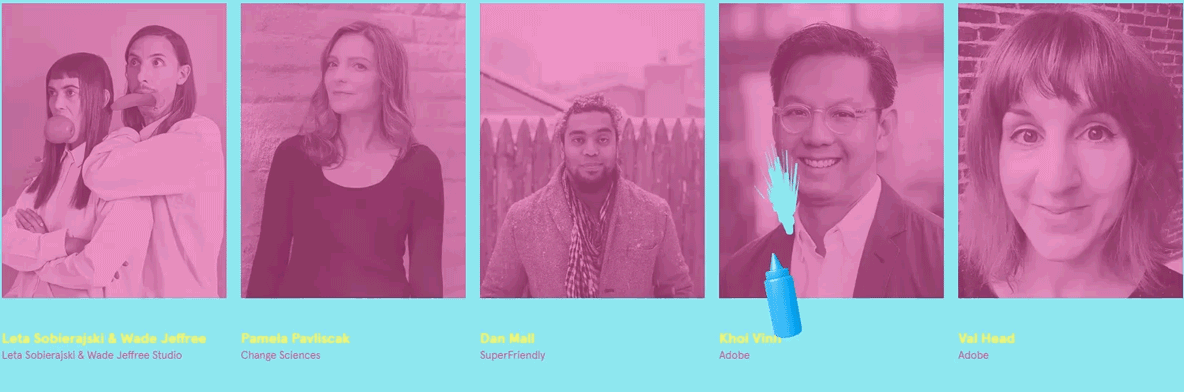 The gemstone of the site is as follows: you can mess with the best known web designers and get away with it. On any image cursor becomes a bottle. You click, the bottle squeezes and the speck of color comes out of it right on the faces of the speakers. Every color theme has its own color of the ‘sauce’.
