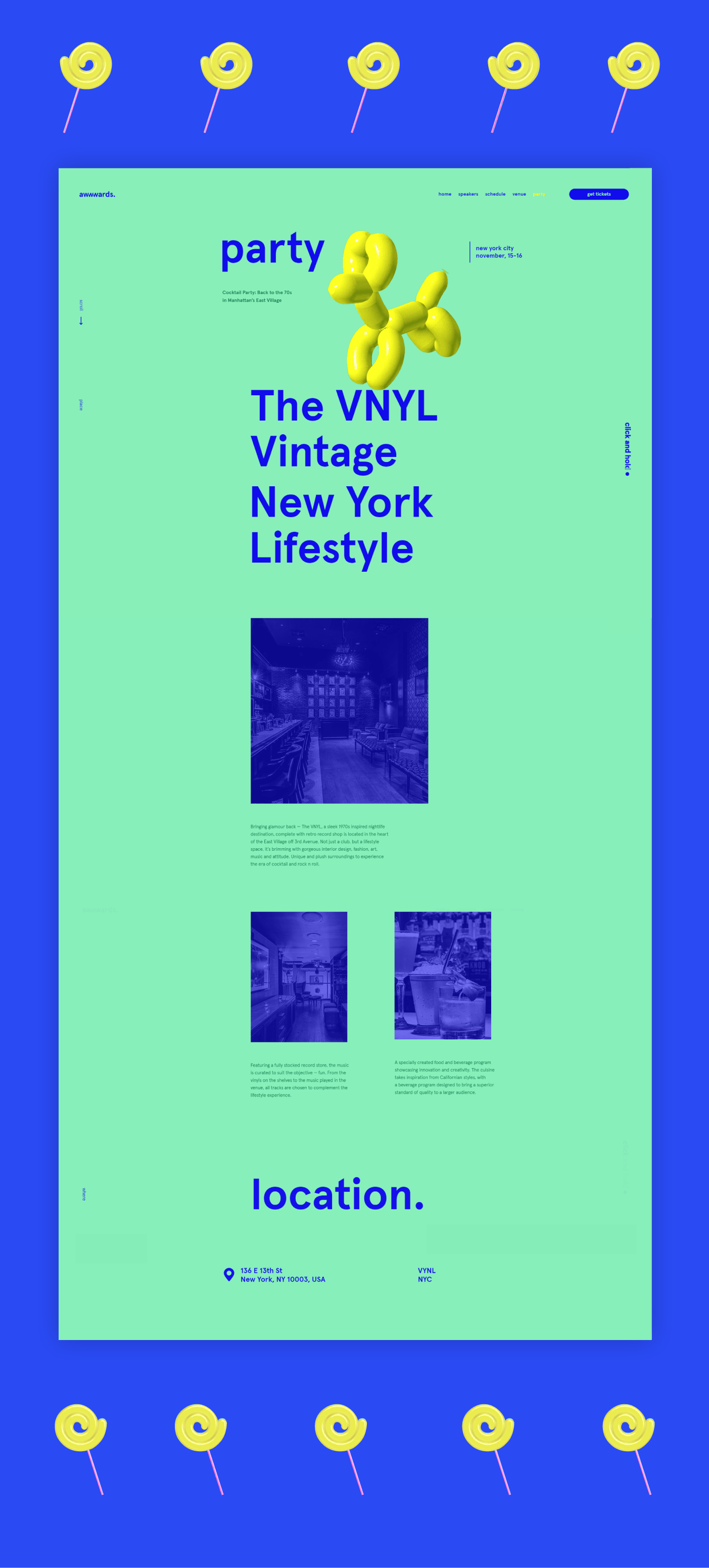 We’ve found great metaphors for the sausages. The main page was given hot dog as the most known american fastfood. French hot dog that looks like a microphone went into the speakers section. Sausage coil on a stick looks like a pin, so it went to the ‘venue’ page. The party section got a balloon dog that is made out of sausages.