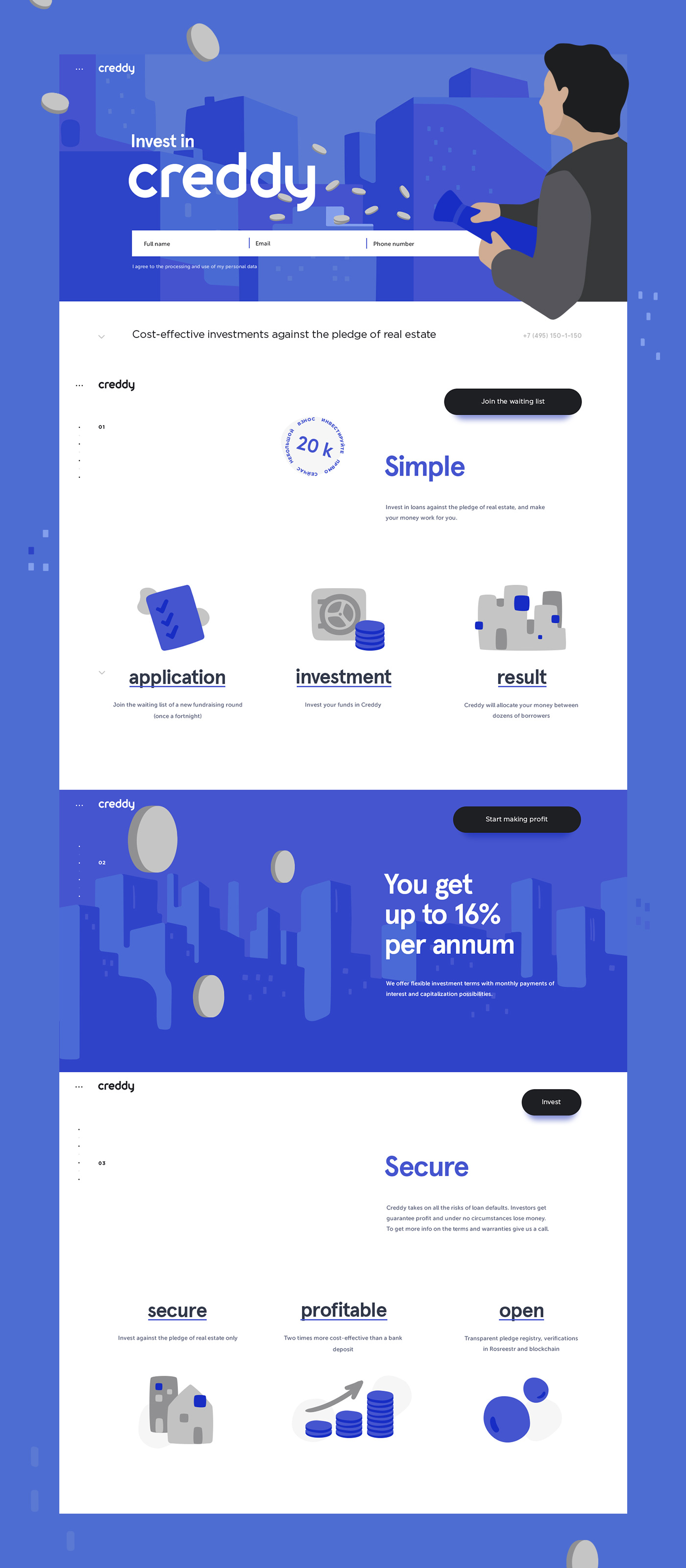 There are houses and coins, calm and credible blue color. Through the consistent use of blocks and illustrations we’ve explained the simplicity of the arrangements, as well as profitability and transparency of the service.