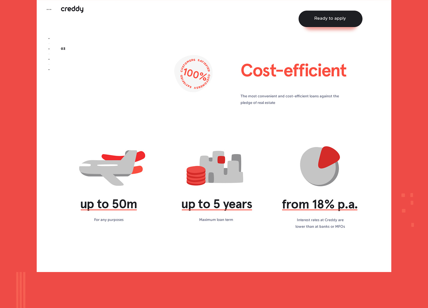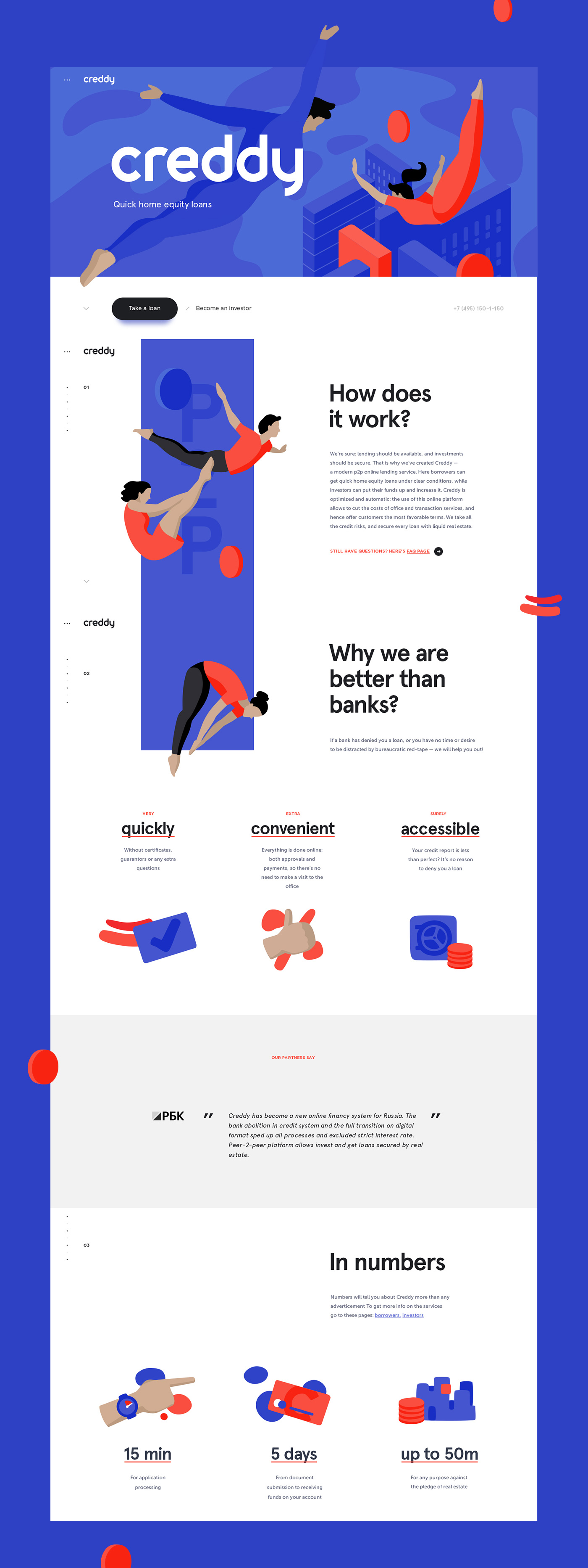 The website’s illustrations metaphorically portray clients and the company. The images aim to create the feeling of a flexible, quick and reliable service that provides opportunities and gives the freedom of action.