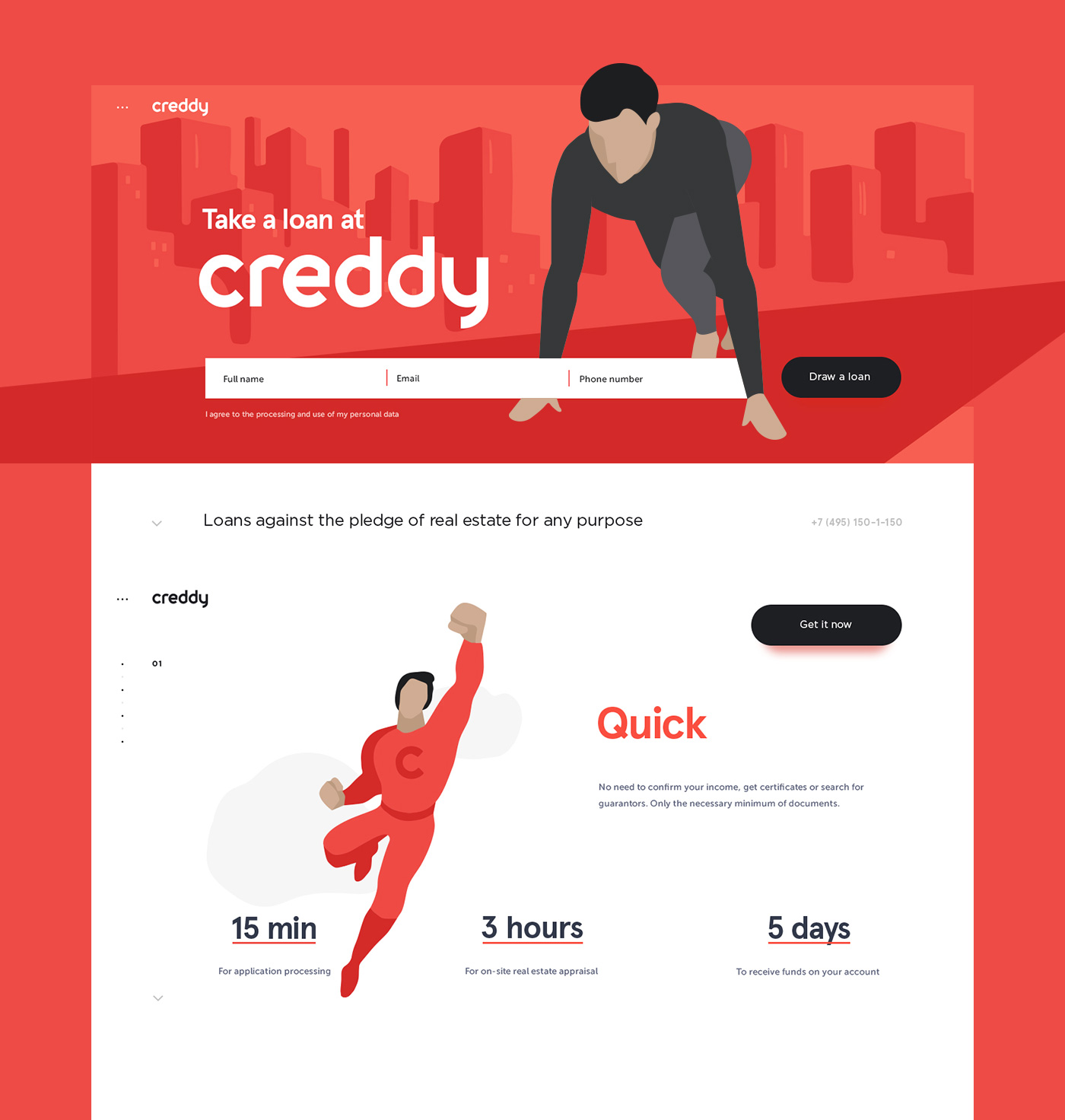 We’ve thought the characters through: a superman rescuing a woman, and a man at a starting line who’s ready for the new accomplishments. Step by step we’ve told about the benefits of the service: speed, reliability and profitability.